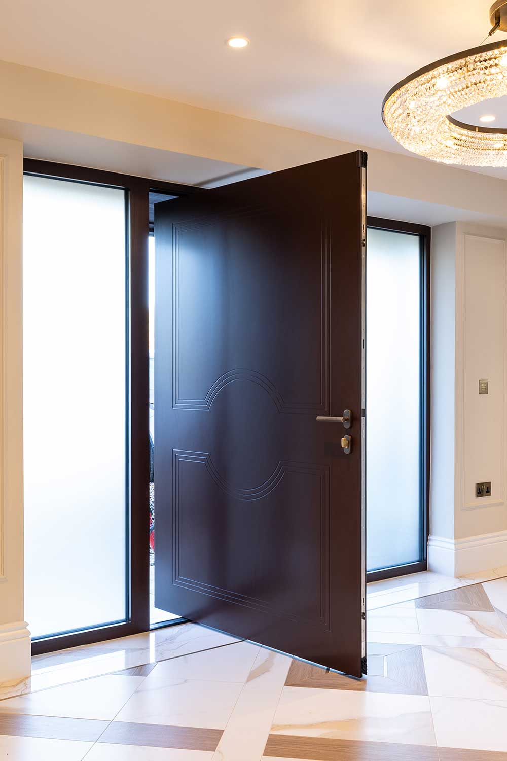 Our Ossido Nero finish below mimics blackened steel. This choice compliments both the external anthracite grey hues and the beautiful marble floor. This modern pivot door combined with our LED recessed handle and fingerprint technology adds extravagance and luxury to this stunning property.